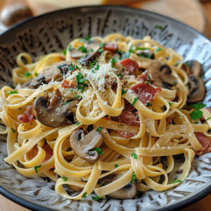 Une version revisitée de la carbonara classique, enrichie de champignons savoureux qui ajoutent une touche de gourmandise et de texture. Un plat réconfortant et rapide à préparer pour les amateurs de pâtes crémeuses !