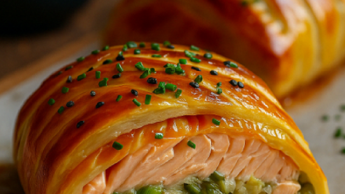 Le feuilleté au saumon et aux poireaux est un plat élégant qui allie la délicatesse du poisson à la douceur des légumes, le tout enveloppé dans une pâte feuilletée croustillante.
